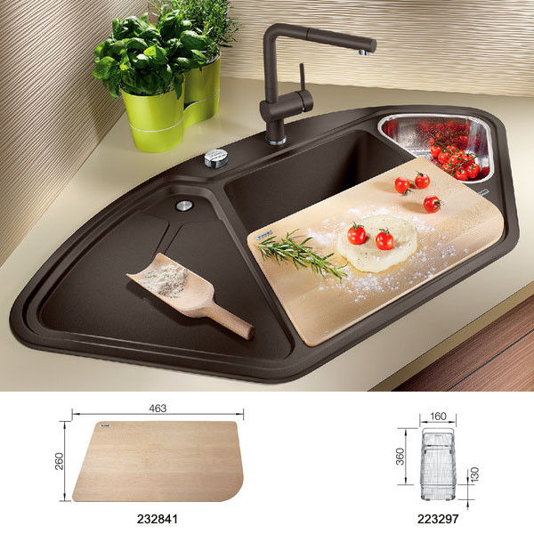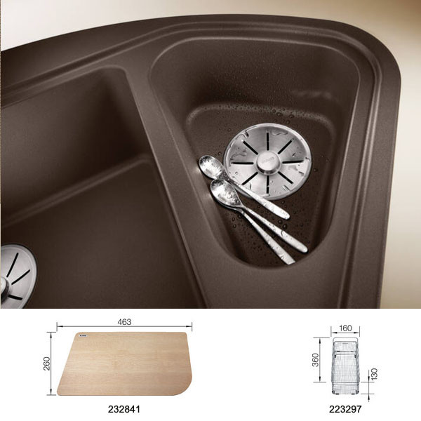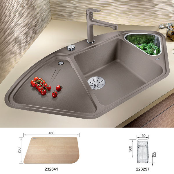 Sarokszekrénybe, építhető silgránit mosogatótálca. Ergonomikus kialakítású medence, kiegészítő medence és csepegtetőfelület. Tágas medence hosszú medenceátlóval a nagyobb edények – például sütőlemezek – kényelmes mosogatásához. Modern kialakítású csepegtetőfelület kerek, rejtett túlfolyóval. Gazdag felszereltség lefolyó-távműködtetővel és InFino szűrőkosárral – elegáns illeszkedés és különösen könnyű tisztíthatóság. Kiegészítő medence perforált rozsdamentes tállal. Kapható 9-féle silgránit színben.