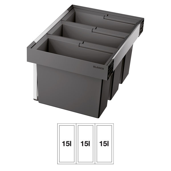 Blanco FLEXON II LOW 60/3 fiókba beépíthető rendszerű hulladéktároló. Osztott fiókos alsószekrényekhez (a 330 mm-es csökkentett beépítési magasságnak köszönhetően). 3 rekeszes (3x15 L). Egyszerű beszerelés jelölés vagy előfúrás nélkül. Modern design, optimális helykihasználás.