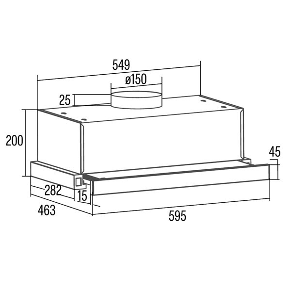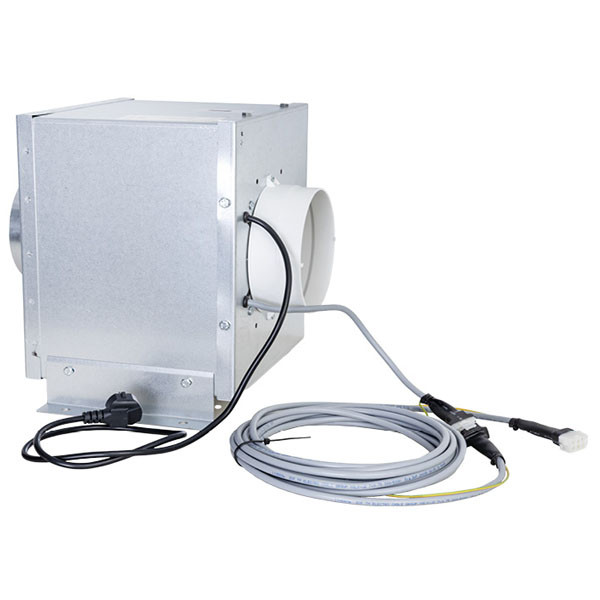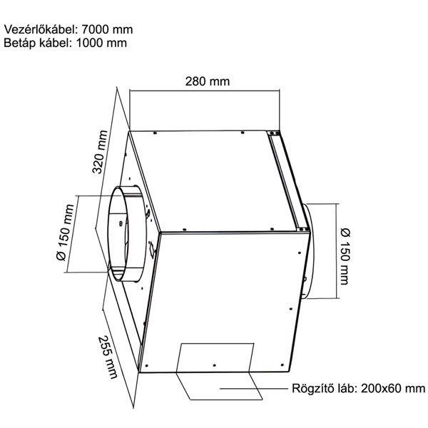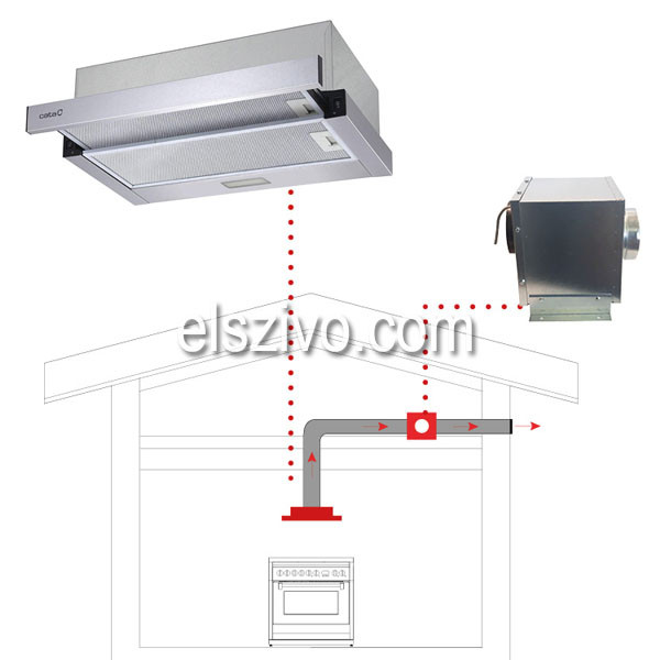 Ebben az esetben két légtechnikai cső közé kell építeni a motort. A motort el lehet helyezni másik helyiségben vagy padlástérben, de minimum 3 méter, maximum 7 méter távolságot kell tartani az elszívó ernyőtől. Max.légszállítás: 800 m3/h, motor teljesítmény: 215 W, légnyomás: 500 Pa, csőcsatlakozás: Ø 150 mm, szinterezett acél burkolat, 7 m vezeték.