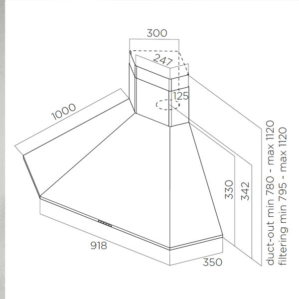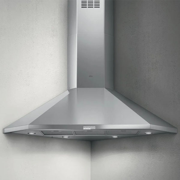 Elica ACUTA IX/F/100 inox sarok páraelszívó 100x100 cm. Inox. Maximális elszívó teljesítmény 800 m3/h. Min-max. zajszint 46-60 (65) dB(A). Vezérlés elektronikus nyomógomb 3+1 fokozatban. LED világítás. A energia osztály!