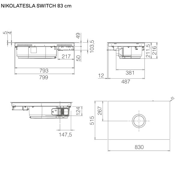 Főzőlap kivágási mérete: 805x409 mm / szintbe építés esetén, külső méret: 830x515 mm belső méret: 805x409 mm
