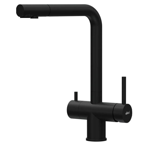 Elleci CROSS pure matt fekete kihúzható csaptelep. Víztisztító berendezéshez is köthető! Elforgatható kifolyócső. Az ívóvíz és a vezetéskes víz külön szabályozható. Minimalista design. Jól illik az azonos színű Elleci gránit - kerámia mosogatókhoz. Nagyobb használhatóság a magas kifolyó révén, könnyen feltölthető magasabb edények, vázák. Minden Elleci mosogatóhoz ajánljuk.