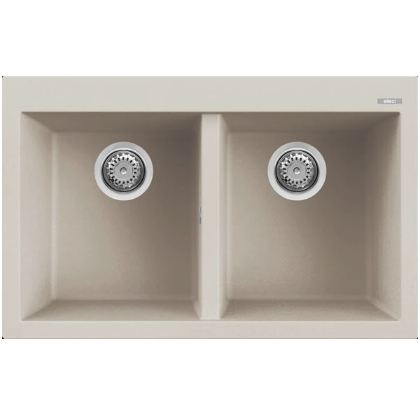Elleci QUADRA 350 G39 Bianco soft gránit kétmedencés mosogatótál, 790x500 mm, 80cm-es szekrénymérethez. Medence mélysége 21 cm! Egyszerű klasszikus formavilág. 10-féle granitek és 3-féle metaltek színben.