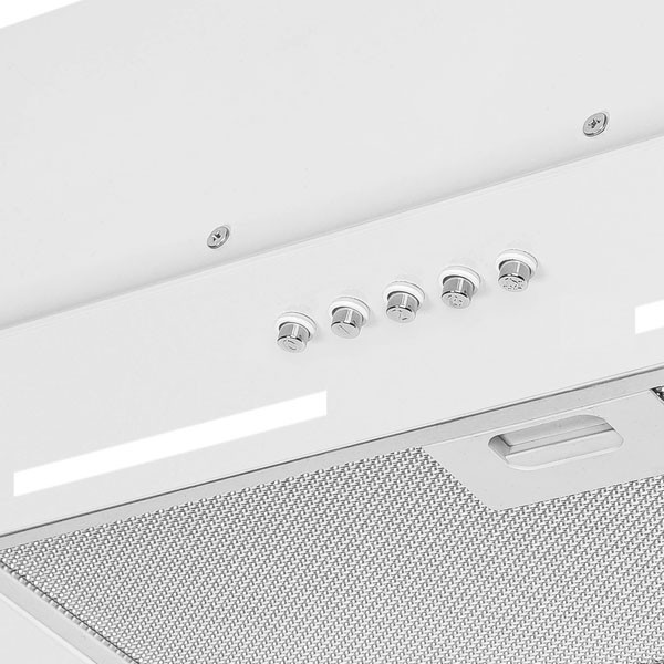 Evido FADE 60GW fehér beépíthető páraelszívó 60 cm. Fehér üveg keret. Zajszint 49-65 dB(A). Tekerőgomb vezérlés 3 fokozatban, maximális elszívókapacitás (légkivezetésnél): 500 m3/h. Mosható alumínium zsírszűrő. LED világítás. C energia osztály!