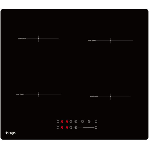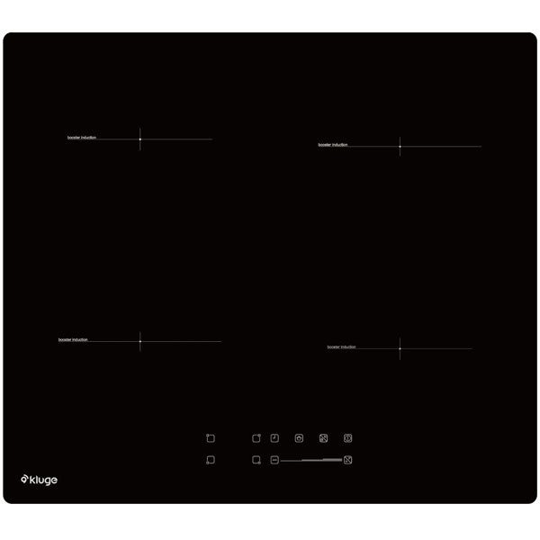 Kluge KPI6015B indukciós főzőlap. 60 cm. Fekete üvegfelület egyenes csiszolt élekkel. Touch Slider vezérlés, 4 zónás indukciós főzőlap, Booster. LED kijelző. 9-fokozat. Időzítő, Maradékhő-kijelző. Gyerekzár. Teljesítmény: 7,0 kW.