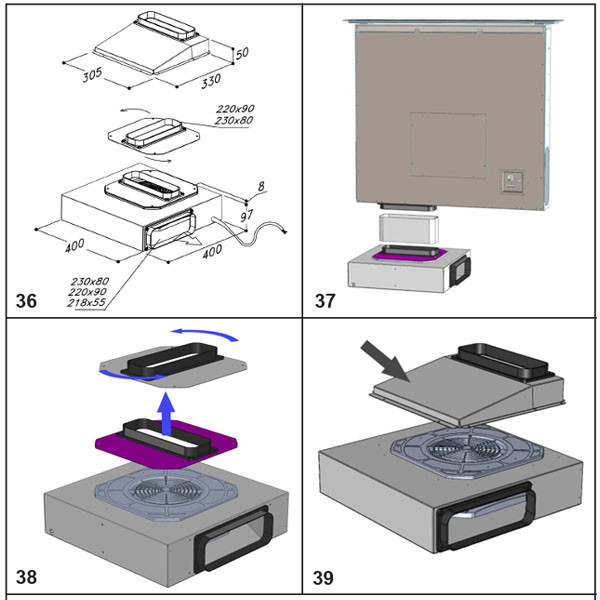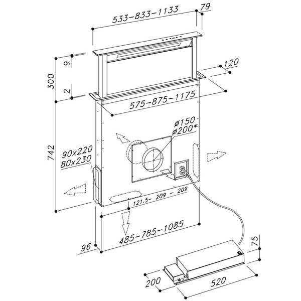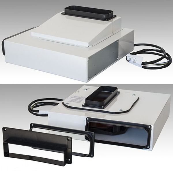 Sirius SEM10 konyhabútor lábazatába építhető külső motor: A külső motoros megoldás eredményezi a legcsendesebb konyhai elszívást. Az elszívó motor (ventilátor egység) nem magában a páraelszívóban kerül elhelyezésre, hanem egy külső egységben. Ebben az esetben a motort a konyhabútor lábazatába kell telepíteni, így szinte szabadon marad a felette lévő szekrény. Csatlakozási mérete: 220x90 mm lapos csőrendszerrel.