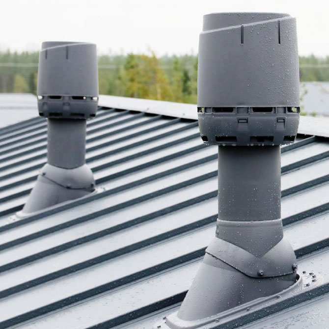 Szellőztetésre szolgáló szigetelt tetőventilátor. A cső egy beépített, 50 mm vastag zajszigeteléssel rendelkezik. A belső cső horganyzott acélból készül és fésűs tömítéssel van ellátva. A tetőfedő anyagnak megfelelő VILPE átvezető elem külön beszerzése szükséges. Méretek: Ø160 mm-es csővezeték, Ø225 mm-es külső átmérő, tető feletti magasság kb. 500 mm.
